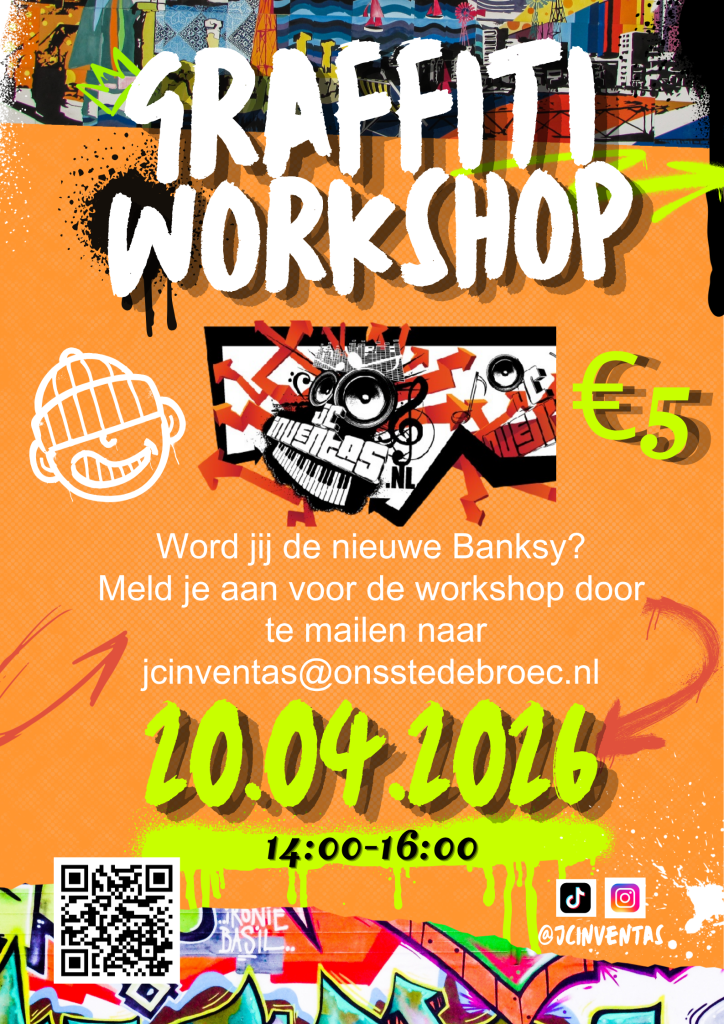 Graffiti Workshop 20 april 2026 Graffiti Workshop Word jij de nieuwe Banksy? Meld je aan voor de workshop door te mailen naar jcinventas@onsstedebroec.nl 20-4-2026, 14:00 – 16:00 uur.